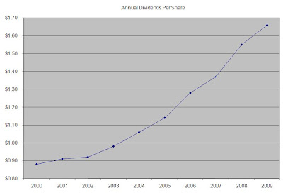 The dividend payout has declined from a high of 57% in 2002 to a low of 17.8% in 2008., before increasing to 41.70% last year. A lower payout is always a plus, since it leaves room for consistent dividend growth minimizing the impact of short-term fluctuations in earnings. The company has returned money to shareholders exclusively through share buybacks, which are typically not as consistent as increases in dividends.